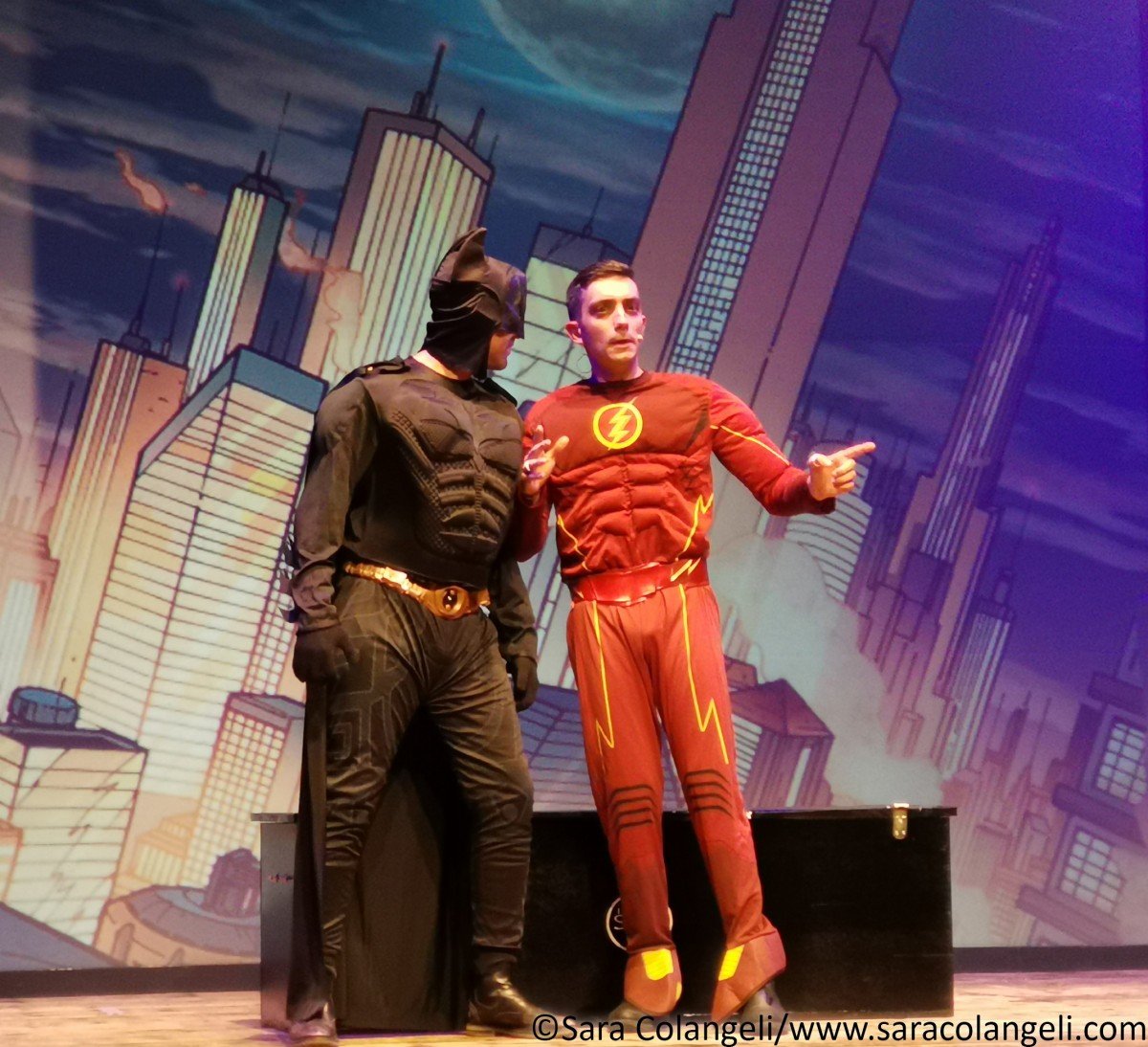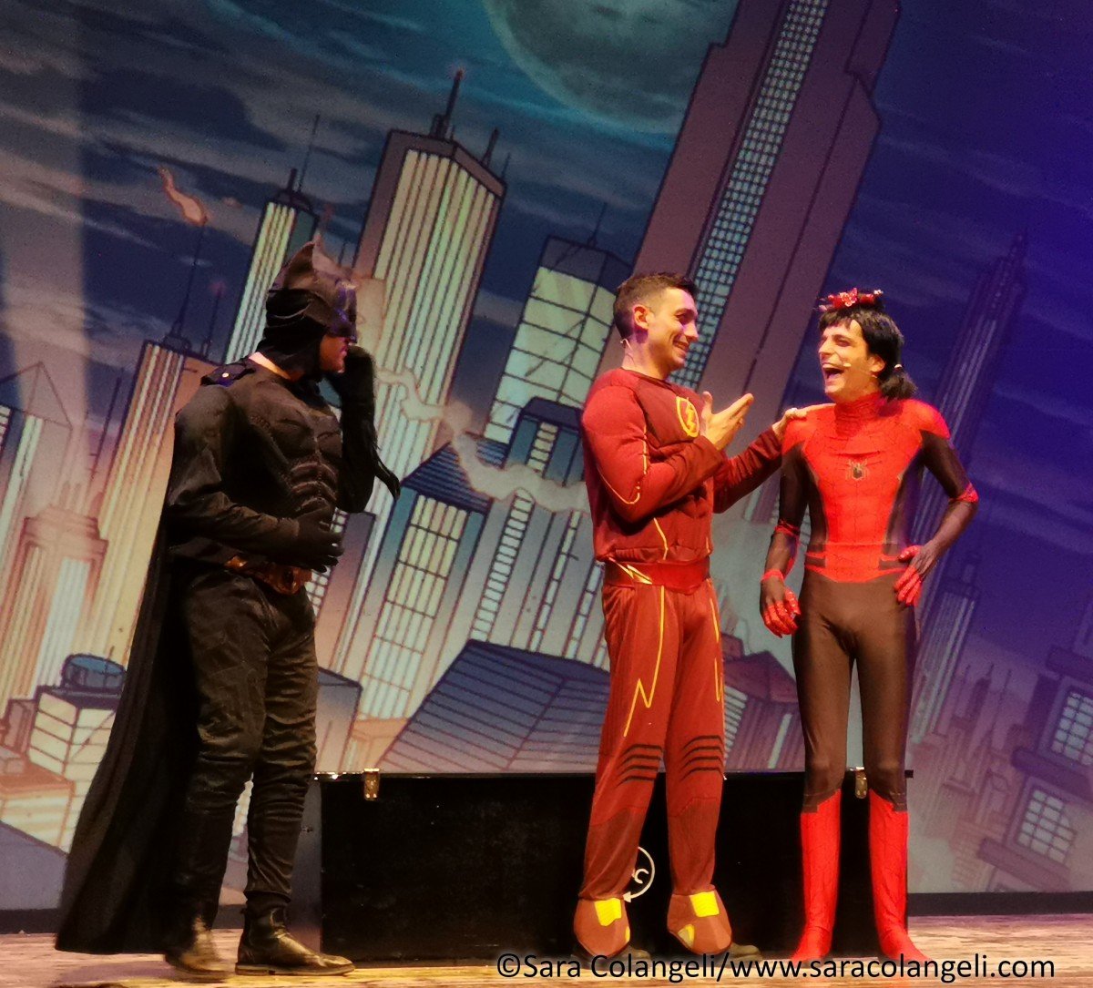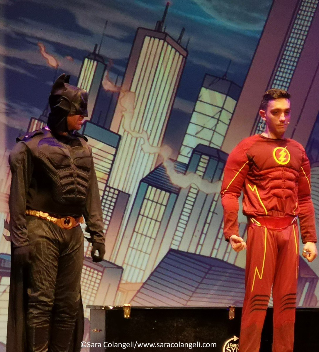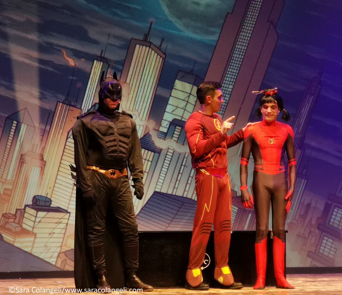 Il messaggio era chiaro anche nelle passate edizioni, ma in questo PopArt Revoution, è ancora più evidenziato ad ogni finale di scena. Ridendo tra una battuta e l’altra, ci si trova a parlare di emigrazione ed immigrazione, degli anziani lasciati soli (mentre per i cani si riserva un trattamento diverso), la morte fa ridere, fino ad arrivare a quello più significativo di tutti: la donna è un bene prezioso e non va toccato, inscenato con il monologo di Shakespeare interpretato da Federico Campaiola. Si passa da spazi interstellari con Star Wars e il capitano KirkEEEEEEE ai supereroi DC/Marvel. Se Alessio è un Batman ingessato, Alessandro è un Flash gonfiato… Federico fonde il costume di Spiderman con Lady Bugs, generando un supereroe cinese irriverente e comico.
